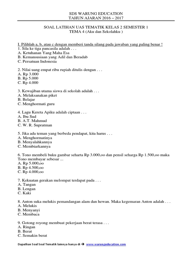 Download soal uas/pas tematik kelas 1 tema 8 kurikulum 2013 untuk contoh soal uas/pas tematik kelas 1 semester 2 kurikulum 2013 soal uas/pas ini bisa anda gunaka sebagai referensi dalam belajar untuk mempersiapkan diri dalam menghadapi uas/pas tahun pelajaran 2019/2020. Silanglah pada jawaban yang paling benar ! Apa kepanjangan dari tik … a. Kumpulan contoh bank soal ulangan terbaru, ujian sekolah, soal uas, soal uts, soal ukk, soal un dan materi pelajaran sd, mi, smp, sma, smk. Pada dasarnya, pertanyaan tentang tes ukk. Soal uas matematika sd kelas 2. Soal uas/pas kelas 2 semester 1 sd/mi k13 tematik sd/mi terbaru tahun 2021 merupakan contoh soal yang dapat dipergunakan oleh guru dalam pelaksanaan penilaian akhir semester (pas) atau ujian akhir semester (uas). Download soal tematik kelas 4 sd tema 4 subtema 1 jenis. Soal uas/ukk sd ini dapat dipergunakan sebagai contoh soal bagi bapak/ibu pengajar dan juga dapat dijadikan sebagai latihan bagi siswa sd kelas 1 dalam menghadapi ujian akhir semester 2 (genap). Berilah tanda silang (x) pada huruf a, b, atau c pada jawaban yang benar 1. Soal uas tik kelas 2 semseter 1 tahun ajaran 2016/2017. Kunci jawaban soal uas penjas i. Soal uas penjaskes kelas 2 sd kurikulum 2013.